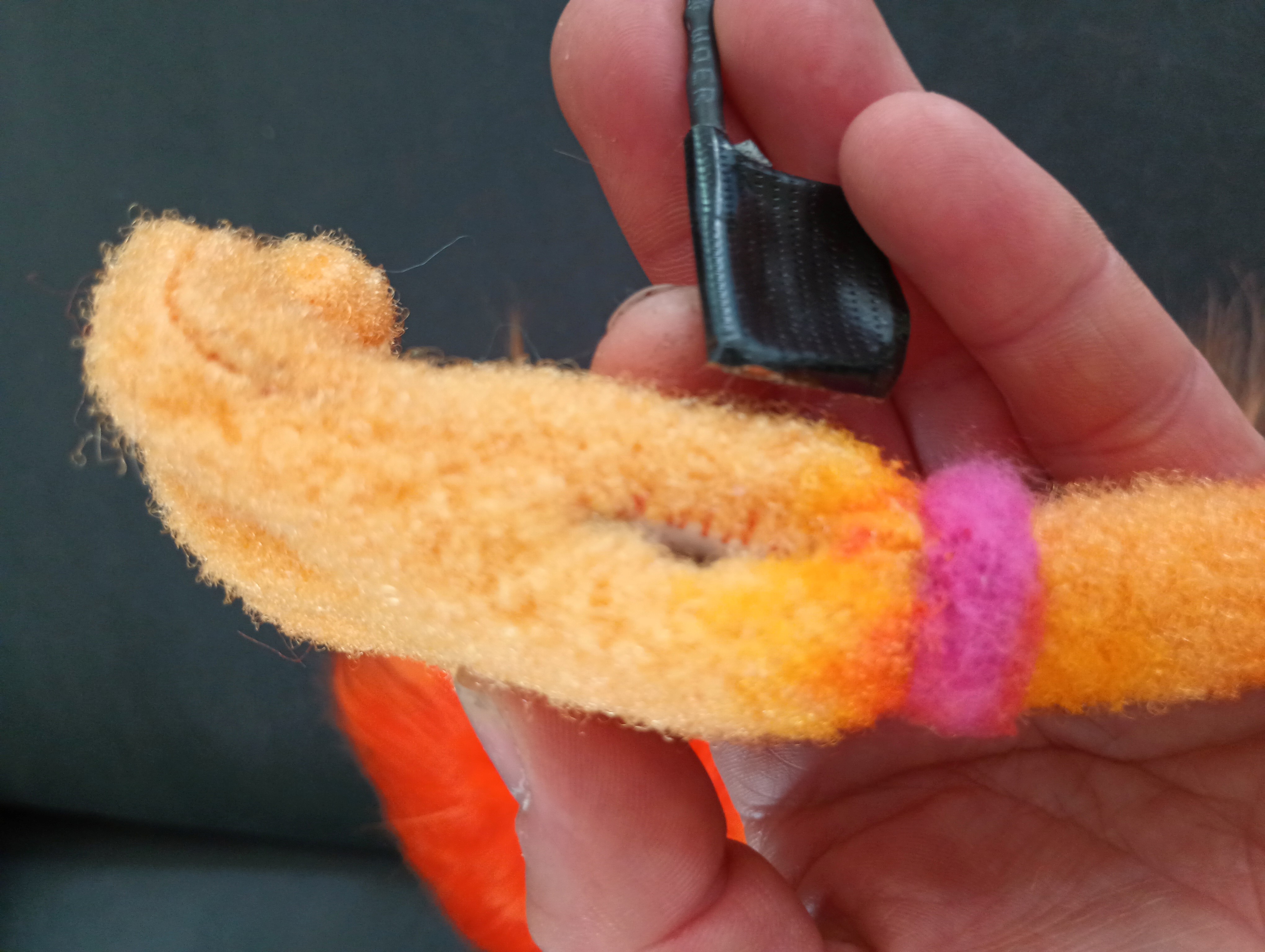 Many of these puppets have a separate body/head and neck sleeve. This allows for greater movement of the head. You can adjust the head to have a longer or shorter neck as you please. A safety pin is used to keep it in place. Alternatively, the head and body can be all one piece. This is a simpler style and does not necessarily have a foam body piece inside. Both work very well, it just depends on what the puppeteer is looking for. The hands have a wire armature inside. The fingers are poseable. There is an arm rod pocket on each hand in which the removeable arm rod will fit. Straight pins are then used to close up the pocket so that the rod stays in place.